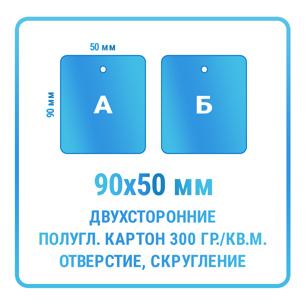 Бирки двухсторонние 50х90 мм с отверстием и скруглением углов (материал - мелованный картон 300 гр./кв.м.)