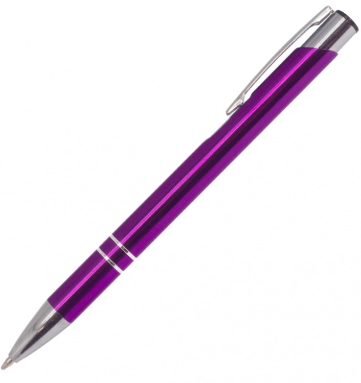 Классическая металлическая шариковая ручка COSMO (фиолетовая) с цветным напылением корпуса и глянцевыми хромированными металлическими деталями ( носик, клип и два металлических кольца на корпусе ручки ). Несмотря на страну производства - Китай, ручки выполнены очень качественно и не возникают нареканий по качеству материала ручки, а так же стержню.