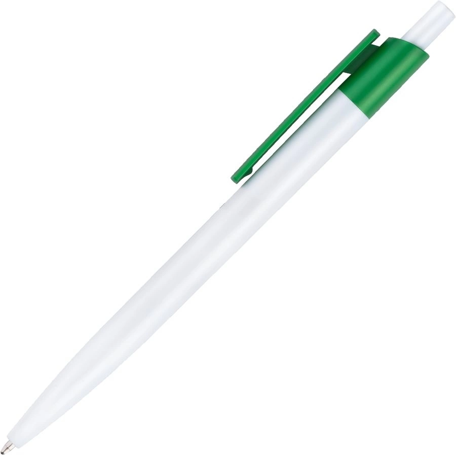 Классическая недорогая пластиковая ручка Vivapens HIT (белая с зеленым) с широким клипом, который отлично подходит под нанесение логотипа и другой информации.