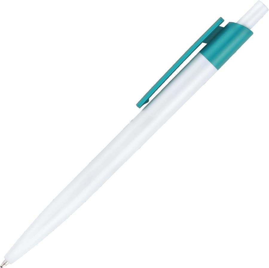 Классическая недорогая пластиковая ручка Vivapens HIT (белая с бирюзовым) с широким клипом, который отлично подходит под нанесение логотипа и другой информации.